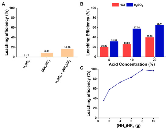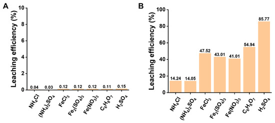 Ammonium-salt-based leaching techniques have been widely used in the weathering crusts for rare earth element mining [23]. Five salt-based leaching solutions, including two ammonium-salt-based solutions (NH4Cl, (NH4)2SO4) and three ferric-salt-based solutions (FeCl3, Fe2(SO4)3, Fe(NO3)3), were assessed with C6H8O7 and H2SO4 for directly leaching Li from minerals. In total, 5 g of clay minerals was agitated (160 rpm) with 25 mL of a leaching solution (10%, w/v) at 25 °C for 2 h. The results indicated that the recovery efficiency of all these leaching solutions was lower than 0.15% (Figure 3A), demonstrating that direct leaching barely extracts Li from clay minerals. It can be deduced that Li-bearing clay minerals, which are phyllosilicates with crystal structures primarily composed of two tetrahedral sheets and an octahedral sheet [9], restrict the extraction of Li due to Li+ and other cations substituting for Al3+, Fe3+, and Mg2+ in octahedral sites.