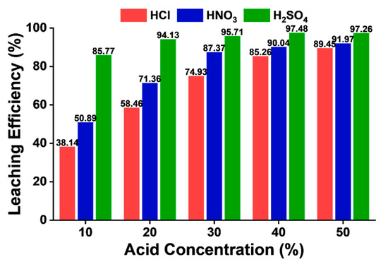 Owing to the highest recovery efficiency of H2SO4, the concentration of the acid was further optimized using three different inorganic acids (HCl, HNO3, and H2SO4) at five levels (10%, 20%, 30%, 40%, 50%, v/v). The leaching efficiency increased with the acid concentration, reaching a plateau at 40% (v/v) for all three acids (Figure 4).