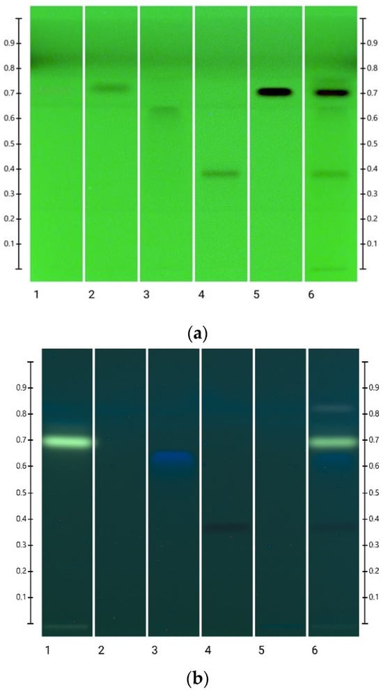 - Cimpoiu, C.; Casoni, D.; Hosu, A.; Miclaus, V.; Hodisan, T.; Damian, G. Separation and Identification of Eight Hydrophilic Vitamins Using a New TLC Method and Raman Spectroscopy. J. Liq. Chromatogr. Relat. Technol. 2005, 28, 2551–2559. [Google Scholar] [CrossRef]