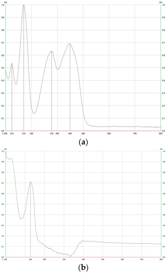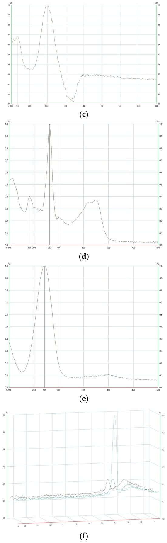 The absorption maxima of vitamins (a) B2—270 nm, (b) B3—264 nm, (c) B6—296 nm, (d) B12—363 nm, and (e) C—271 nm, over a spotted standard spectrum at (f) 264 nm, (g) 270 nm, and (h) 271 nm for vitamins B2, B3, and C.
