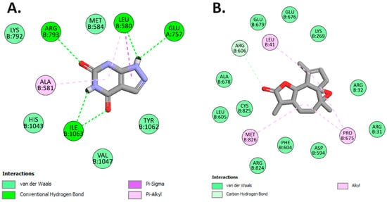 - Throughout the computational interaction process, we implemented a semi-flexible modeling approach utilizing the extensively employed PyRx AutoDock Vina molecular docking software. Within PyRx, the target proteins were prepared and designated as macromolecules [46]. The 3D conformers of all ligands, initially in SDF format, were introduced into PyRx and subjected to energetic optimization. Subsequently, they were converted to pdbqt format using the Open Babel tool within the PyRx AutoDock Vina software, with a selection of the most optimal hit [47]. The results of the docking analysis were projected, and the outcomes, in conjunction with the docked macromolecules and ligands, were exported as output files in pdbqt format. These ligand and macromolecule files were merged and preserved in PDB format for further scrutiny using PyMol software. Ultimately, 2D visualizations were generated utilizing Discovery Studio Visualizer (version 4.6).