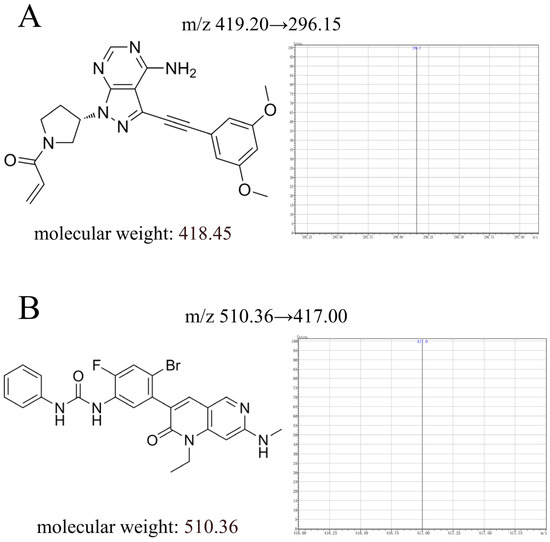 The chemical structure, molecular weight, and daughter ion of futibatinib (A) and ripretinib (B) in this study.