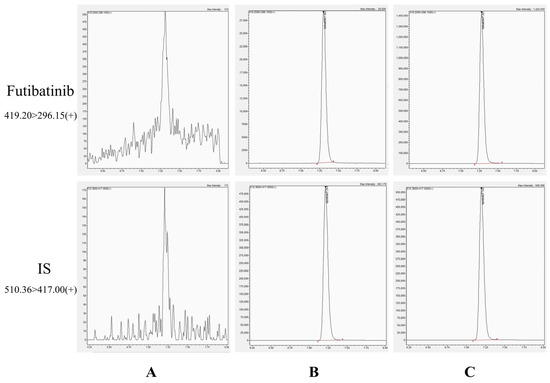 Chromatograms of futibatinib and ISTD. (A) blank plasma; (B) a blank plasma spiked with futibatinib (1 ng/mL) and ISTD (200 ng/mL); (C) a plasma sample (46.08 ng/mL) 1.5 h after giving futibatinib.