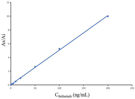 The standard curve was obtained through evaluating the response of the instrument to futibatinib over a defined range of concentrations (1, 2, 5, 10, 20, 50, 100, and 200 ng/mL). The linear regression of futibatinib was carried out by the least square method on the peak area ratio (y, futibatinib/ISTD) versus the corresponding concentrations (x), where the y-axis was the ratio of the peak area of futibatinib (As) to the peak area of ISTD (Ai). The smallest value of the standard curve was LLOQ.