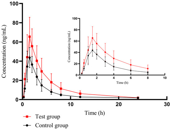 The mean plasma drug concentration–time curve of futibatinib in two groups. The control group: futibatinib alone administration; the experimental group: futibatinib co-administration with YCHD.