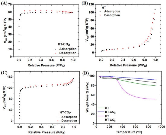 N2 adsorption/desorption isotherms of BT-CO2 (A), HT (B), and HT-CO2 (C). TG of HT, HT-CO2, BT, and BT-CO2 (D).