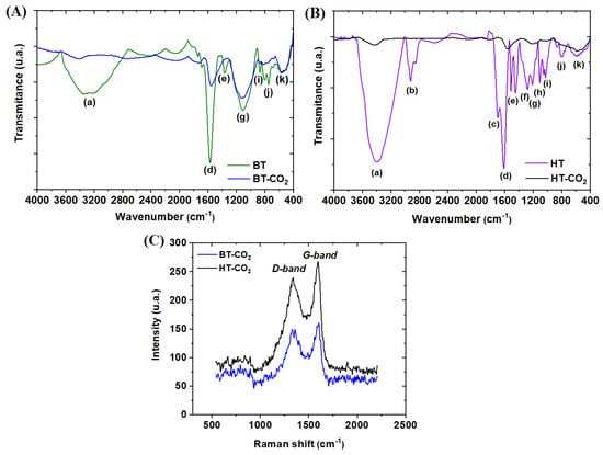 FTIR spectra of BT and BT−CO2 (A) and HT and HT−CO2 (B). Micro−Raman spectra of HT−CO2 and BT−CO2 (C).