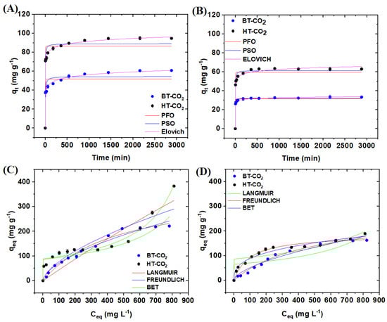 The experimental data from the adsorption kinetics tests of acetaminophen and caffeine using BT-CO2 and HT-CO2 are depicted in Figure 4A and 4B, respectively. It is evident that both BT-CO2 and HT-CO2 exhibited rapid adsorption capacities for acetaminophen and caffeine initially, but after 540 min, the rates decreased. Ultimately, equilibrium was reached around 1440 min, where the qt values stabilized at approximately 60.8 and 94.7 mg g−1 for acetaminophen using BT-CO2 and HT-CO2, respectively. The adsorption capacities for caffeine in aqueous solution were 33.4 and 63.0 mg g−1 for BT-CO2 and HT-CO2, respectively.
