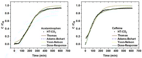 Given the best performance of the HT-CO2 sample in adsorbing both adsorbate molecules, fixed-bed experiments were carried out only with this adsorbent. The breakthrough curve of effluent concentration (C/Co) versus time and the mathematical modeling of acetaminophen and caffeine adsorption on HT-CO2 are presented in Figure 5, while column performance data are shown in Table 6. The maximum adsorption capacity of acetaminophen and caffeine by HT-CO2 was 82.23 and 45.60 mg g−1, respectively.