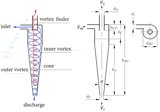 The versatility of hydrocyclones (HCs) encompasses solid–liquid and liquid–liquid separation, stemming from their initial recognition in the mining industry pioneered by Eugene Bretney [1]. Adaptations to their geometry enhance their performance, leading to broad applications across mechanical, chemical, environmental, and biotechnological engineering. The fundamental principle of both gas cyclones and hydrocyclones is similar, relying on separation through centrifugal forces [2,3,4]. In an HC, a liquid loaded with solid particles (suspension) undergoes a strong rotational motion due to the laterally offset inlet. An external vortex forms, spiraling along the cyclone wall into the lower section—the cone. The density difference between solid and liquid components, coupled with centrifugal forces, accumulates the solid particles at the narrowing part of the cone, where they are discharged. As a minimal volume of concentrated suspension exits the underflow, the lower concentration suspension exits axially via the cyclone’s vortex finder, creating an internal vortex. This configuration, due to the reversal of the two main flows in the cyclone’s separation chamber, is known as a countercurrent cyclone. Notably, this countercurrent principle allows for highly efficient particle separation. Cyclonic separation remains pivotal due to operational efficacy, utilizing centrifugal forces to isolate dispersed solid particles in fluids. Its basic design with relevant variables is depicted in Figure 1.