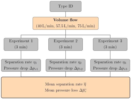 Moreover, this dilute stream separation aims to highlight disparities in the cyclone’s separation performance without turbulence damping, which is common in dense stream separation [5]. Dense stream separation is usually defined with solid fractions of φS > 0.2–0.3 and needs specific consideration because of the increased influence of the solid particles on the fluid flow. The underflow-to-overflow ratio is also set at 1% to reduce discharge at the underflow and, subsequently, liquid loss from the system. Experiments are conducted at three different feed flow rates with 40 L min−1, 57.5 L min−1, and the highest flow rate of 75 L min−1, respectively. Before each experimental run, the HC is emptied to ensure no remaining particles. Moreover, 75 g Carolith 0–0.2 dissolved in 30 L water (cI = 2.5 g L−1) is used as feed material and mixed for 20 s before the separation assessment. After 18 s, underflow discharge is initiated using the interval-controlled pneumatic valve at the underflow. The final underflow discharge occurs after 3 min, followed by experiment termination by flushing and resetting the system. After the experiment, the suspension is allowed a minimum of 12 h to settle to ensure complete solid sedimentation. Subsequently, most of the water is decanted, and any remaining water is removed using a 60 mL syringe. Finally, the remaining damp solid is dried until the Carolith coarse material becomes powdery. The experimental procedure is summarized in Figure 7.