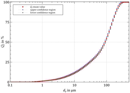 At volume flow rates of 40 L min−1 and 57.5 L min−1, differences in classification behavior are noticeable, especially in the formation of the re-rise of the separation curve in the fine particle range. The indicative parameter for classification sharpness according to Eder approaches values of approximately 0.5 (Equation (9)) in the experiment. Hence, the separation process lies within the range of technical classification [14]. The particle diameters derived from the fractional efficiency curve at the ordinates 0.25 and 0.75 correspond to the diameters and .
