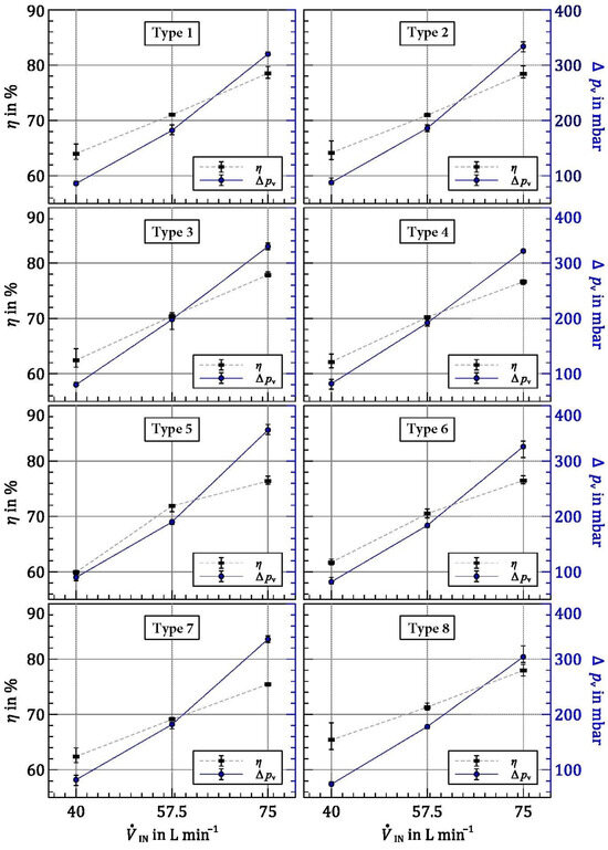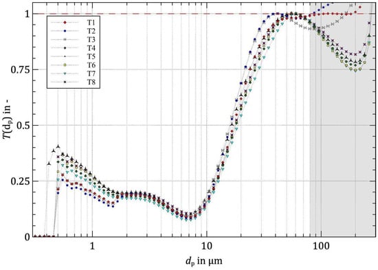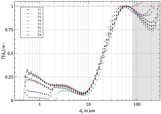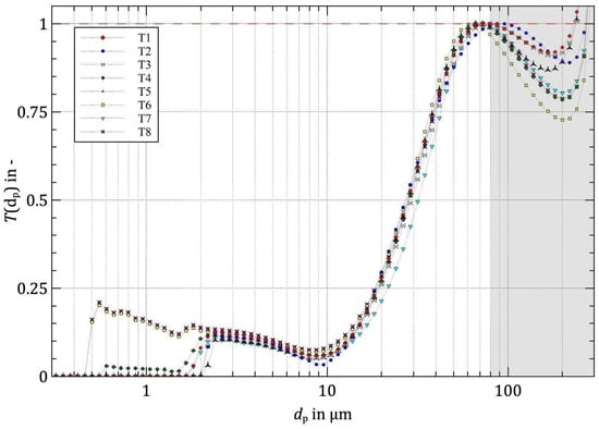 The determined fractional efficiency curves for all cone models are categorized according to the three volume flow rate settings used. Beginning with the flow rate of 40 L min−1, Figure 10 illustrates that the cut particle diameters range between approximately 29 and 34 μm. The shapes of the fractional efficiency curves differ minimally, except for Types 6 and 8. Those fractional efficiency curves exhibit a renewed increase in the functional graph in the fine particle range. Raw data (particle size distributions) can be found in the Supplementary Material.