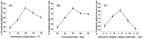 Effect of the α−terpineol spiked recovery rate: (a) extraction temperature, (b) extraction time, and (c) solvent to sample volume ratio.