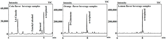 Six lemon-flavor carbonated beverages from different manufacturers were pretreated with Section 2.2.1, and it was shown that seventeen volatile components were identified in the six samples using GC-MS. α-Terpinol was detected in all six samples shown in Figure 5.