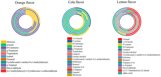 Combining Table 2, Table 3 and Table 4 with Figure 4, it is observable that the compounds contributing significantly to the aroma profile in orange-flavor carbonated beverages are myrcene and D-limonene. In cola flavor carbonated beverages, the substances with a substantial contribution to the aroma includes p-cymene, d-limonene, 1,8-cineole, and fenchyl alcohol. For lemon-flavor beverages, the major contributors to the aroma profile are octanal, d-limonene, and fenchyl alcohol. In summary, D-limonene exhibits a high contribution to the aroma profile across all three types of carbonated beverages.