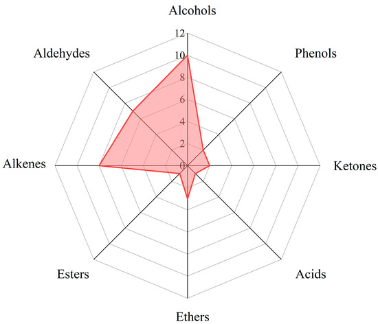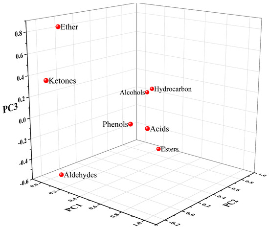 The characteristic roots (total) and contribution (cumulative) of the principal components in the 18 carbonated beverage samples were used as the basis for selecting the principal components. In combination, it can be found that the contribution percentage of the characteristic root greater than 1 came from the first three factors. The contribution percentage shows that the total variance of the three factors reached 77.153%, and the three-factor model can explain 77.153% of the entire analyzed data. Continuing the analysis through the results of the load matrix in Figure 6, the functional group categories with high positive correlations in the first principal factors (PC1) were acids and phenols. The second principal factors (PC2) had a high positive correlation for hydrocarbons and alcohols. The third principal factors (PC3) had a high positive correlation for ethers.