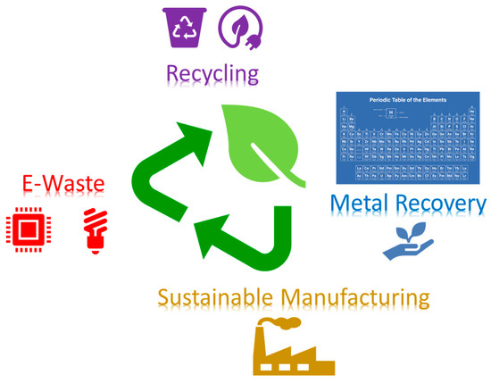 Although, traditionally, these minerals have been extracted from ores by means of mining processes, their increasing demand makes it necessary to look for alternative ways of supply from secondary sources. In line with the Sustainable Development Goals (SDGs), these alternatives should fulfil two main objectives: waste management and selective recovery of metals. This will positively contribute to the SDG 12th (Responsible consumption and production) goal, contributing to an efficient use of natural resources and reducing waste, and SDG 13th (Climate action), e.g., cobalt is essential in the electrification of mobility. For example, in this sense, red mud [3,4,5,6] and phosphogypsum [7,8,9] have been employed as secondary sources of rare earths, while e-wastes have been employed as secondary sources of rare earths [10] or other critical metals such as gallium, indium [10,11,12], lithium [13,14], or cobalt [15,16], within the concepts of urban mining as the alternative of traditional mining and a circular economy [17], as shown in Figure 1.
