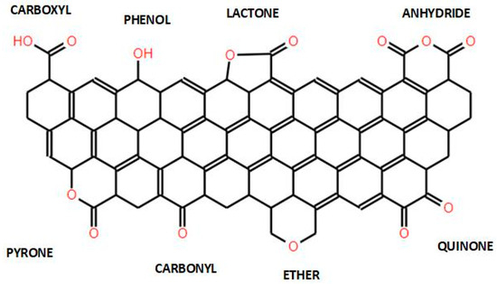 Carbonaceous materials have been purposely employed as adsorbents due to their large surface area, their porous structure, and their superficial chemistry. This last characteristic is what determines their suitability as metal adsorbents: the presence of acidic groups on their surface allows the adsorption via ion exchange, although metals can also be adsorbed on the aromatic rings by electrostatic interactions with π electrons. Among them, activated carbons are the most employed materials, although other carbonaceous materials such as carbon nanotubes have also been used as adsorbents. In the literature, the employed activated carbons have been commercials, but also obtained from organic raw materials like wood, shells, stones, sawdust, peat, and different waste. In this case, it is necessary to apply a carbonization process to convert the cellulosic internal structure into a purely carbonaceous material [57]. Finally, the activated carbons are usually brought under an activation process to enhance the surface area and increase the number of oxygen-containing groups such as carboxyl, carbonyl, esters, lactones, and phenolic hydroxyl groups, and others, such as amido, sulfhydryl, acetamido, and amino [58]. The acidic groups introduced during the functionalization process have an affinity for complexation with metals and ion-exchange capacity [59]. The scheme of typical functional groups found in activated carbon is represented in Figure 3.