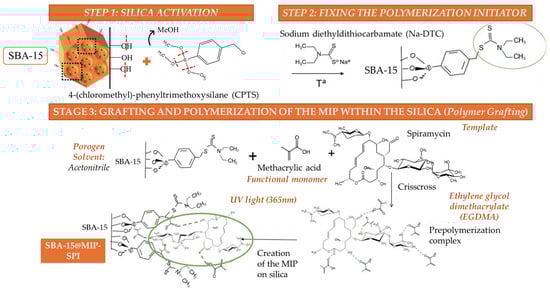 Finally, 0.6 g of the silanized material and the initiator were put in contact with 32 mg of SPI (template molecule), 350 μL of the functional monomer, MAA, and 3772 μL of crosslinking monomer, EGDMA, and were added to 14 mL of the porogen solvent, ACN. The molar ratio of the template molecule/functional monomer/cross-linker was 1:2:10. The polymerization of the mixture was carried out under UV irradiation for 6 h at 365 nm, always maintaining a nitrogen atmosphere. This process was carried out twice to ensure polymerization. To obtain the NIP, the same process was carried out, but without adding SPI to the polymeric mixture. Figure 1 summarizes this process.