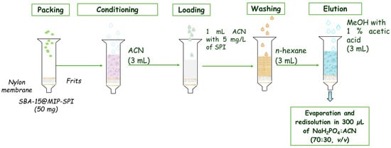 Empty cartridges were packed with 50 mg of SBA-15@MIP-SPI or SBA-15@NIP material and plugged with polyethylene frits at both ends. A nylon membrane (0.45 µm pore size) was also inserted at the bottom of the sorbent bed to prevent material loss during sample loading. The cartridges with the packed material were conditioned with 1 × 3 mL of ACN, followed by 1 mL of a solution of 5 µg/mL SPI in ACN. This was followed by a washing step with hexane (1 × 2 mL) and, finally, the analyte was eluted with 1 × 3 mL of MeOH with 1% acetic acid (Figure 2). Eluates were evaporated to dryness with a stream of nitrogen and redissolved with 300 µL of NaH2PO4/ACN (70:30, v/v) for HPLC-DAD determination (see Section 2.5).