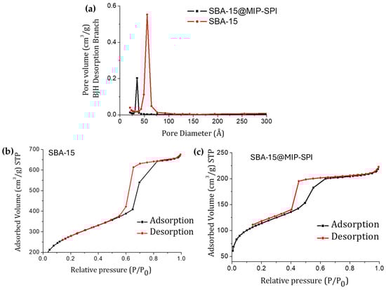 As for the N2 adsorption–desorption isotherms (Figure 3b,c), they show a type IV isotherm, according to the IUPAC classification, with a hysteresis cycle typical of mesoporous materials. The formation of this hysteresis cycle (H1) in the SBA-15 and SBA-15@MIP-SPI represents the capillary condensation of nitrogen within the uniform mesoporous structure. The condensation of the synthesized material occurs at intermediate relative pressures typical of materials with a normal pore size, such as that of the materials studied.