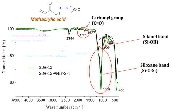 ATR-FT-IR spectra are shown in Figure 4. A broad band is observed at 1062 cm⁻¹, attributed to the siloxane groups (Si-O-Si). This band is associated with typical asymmetric stretching, as can be seen in the spectrum shown in Figure 4. Other typical bands found are the vibration of Si-OH at 956 cm−1, the symmetric stretching of the Si-O bond of the siloxane groups around 800 cm−1 and a bending of Si-O-Si at 438 cm−1, all characteristic of mesoporous silicas. On the other hand, the SBA-15@MIP-SPI is characterized by a band corresponding to a stretching of a carbonyl group, C=O, at 1721 cm−1, characteristic of methacrylic acid, confirming the correct formation of the MIP. Also, adsorption bands were found at 1627 cm−1 and 3325 cm−1 caused by irregular vibrations, OH stretching or the bending vibrations of adsorbed water molecules. The absorption peak at 2344 cm−1 corresponds to the asymmetric stretching vibration of atmospheric carbon dioxide.