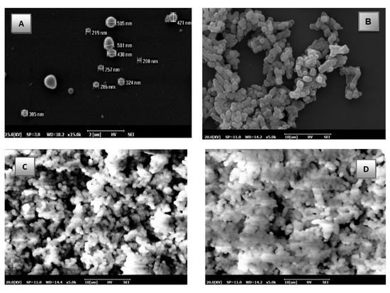 The morphology of the materials synthesized in this work (SBA-15, SBA-15@MIP-SPI and SBA-15@NIP) was studied using an SEM; images of the three materials are shown in Figure 5. As can be seen in Figure 5A,B, the particles of the SBA-15-type silica are quasi-spherical in shape, with particle diameters varying between 200 and 500 nm. In contrast, the SBA-15@MIP-SPI material has fewer spherical and bulky particles than SBA-15 (Figure 5C). These differences in size and shape indicate that the surface of this material was surface-printed. SEM analysis was also performed on the unprinted material (SBA-15@NIP), synthesized with the same process as SBA-15@MIP-SPI but without the addition of SPI in the polymeric mixture. The SEM result of the SBA-15@NIP material shows more agglomerated and undefined particles, unlike SBA-15@MIP-SPI, indicating that the MIP correctly formed on the outer surface of the silica.