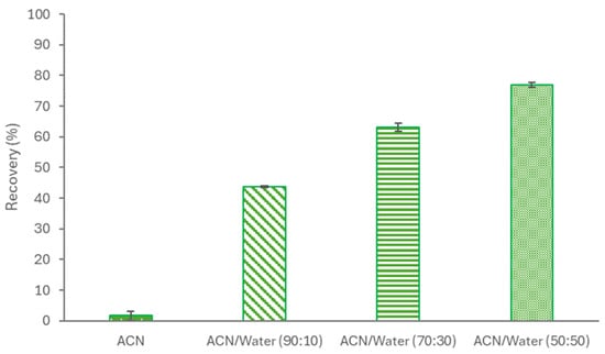 To start the optimization, 50 mg of the synthesized material was packaged to miniaturize the method, since below 100 mg the SPE can be considered miniaturized [30]. Following this step, the loading solvent was checked. For this test, ACN and mixtures of ACN with water in 90:10, 70:30 and 50:50 (v/v) ratios were selected. ACN was selected because, being the porogen in the synthesis process, it can favor specific interactions between the functional groups of the analyte and the functional monomer. For this test, different standard SPI solutions at a concentration of 5 µg/mL prepared in the solvents described above were used and 1 mL of these solutions was loaded into the cartridge previously conditioned with 1 × 3 mL of the same loading solvent. The flow in this experiment was set at 0.1 mL/min. The eluate obtained from the loading step was evaporated, reconstituted in 300 µL of NaH2PO4/ACN (70:30, v/v) and injected into HPLC-DAD. The obtained area was interpolated on an external standard calibration curve (0.1–15 µg/mL) to obtain the concentrations and to calculate the percentage recovery (%). The following formula was used to calculate the percentage recovery: % = (concentration of SPI recovered after purification/concentration of SPI originally taken) × 100. Figure 6 shows the results obtained from this test. As can be seen in Figure 6, ACN demonstrated only 2% recovery, which indicates that SPI was completely retained in the sorbent, unlike the rest of the solvents in which SPI was recovered between 44 and 77%. Mixtures of ACN with water seem to not allow interactions of the analyte with the material. Therefore, ACN was selected as the loading solvent to evaluate the rest of the steps. Next, the test was repeated, increasing the flow to 0.2 mL/min to accelerate the process. The results showed that by increasing the flow, the recovery percentage in the loading stage increased from 2 ± 2% to 33 ± 3%. This result showed that a higher flow makes the interaction between the target analyte and the sorbent more difficult. Therefore, 0.1 mL/min was set as the flow for the rest of the experiments.