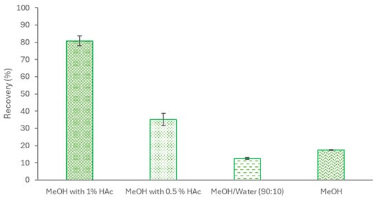 Finally, the effect of the solvent on the elution was evaluated. For this, the previously optimized parameters were used. The cartridge was conditioned with ACN (1 × 3 mL), 1 × 1 mL of standard solution in ACN was loaded, the cartridge was washed with 1 × 3 mL of hexane and different elution solvents were tested: mixtures of methanol water and methanol with acid up to 1%. Percentages greater than 1% of HAc were not tested, because previous studies [31] demonstrated the instability of SPI in more acidic media. Figure 7 demonstrates that the best recovery percentages were obtained with MeOH with 1% HAc. This small amount of acid seems to break the analyte–sorbent interactions, so this solvent was selected to complete the optimization of the SPE process.