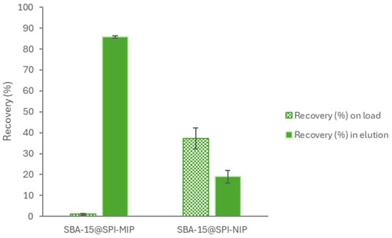 With the conditions obtained in Section 3.2, the selectivity and the effect of printing of SBA-15@MIP-SPI versus SBA-15@NIP were checked. Figure 8 shows how the SBA-15@MIP-SPI material is capable of retaining and eluting the SPI completely (86 ± 1%), unlike SBA-15@NIP (19 ± 3), which loses around 40% of the SPI during loading and is only capable of eluting around 19%. This fact demonstrates the superior selectivity of SBA-15@MIP-SPI against SPI compared to SBA-15@NIP, demonstrating that it is a highly selective and effective sorbent for the extraction and purification of SPI.