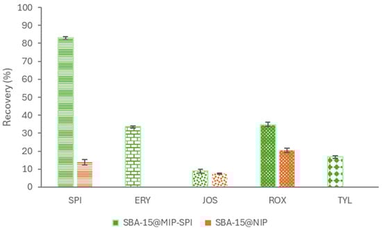 On the other hand, a test was carried out with other macrolides (ERY, JOS, ROX and TYL) and SPI. For this test, the optimized conditions in Section 3.2 were used, but in this case, 1 mL of a solution containing 5 ppm of SPI, JOS, ROX, IVER, ERY and TYL was used. Both synthesized materials, SBA-15@MIP-SPI and SBA-15@NIP, were compared with each other. The results obtained are shown in Figure 9. From this test using SBA-15@MIP-SPI, recoveries between 0 and 35% for JOS, ROX, IVER, ERY and TYL and around 83% for SPI were seen, demonstrating that this material is only selective to SPI. In the case of the SBA-15-NIP material, the results were poor for all the analytes studied with recoveries between 0 and 21%, being in SPI 14 ± 2%.