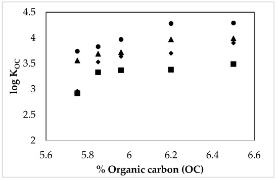 Variation in the distribution coefficients, log KOC of TCC, in two studied natural aqueous systems vs. different concentrations of OC in progressively weathered sediment at 5 and 25 °C, as follows: (•) C.e. 290 µS/cm at 25 °C; (♦) C.e. 290 µS/cm at 5 °C; (▲) C.e. 700 µS/cm at 25 °C; (■) C.e. 700 µS/cm at 5 °C
