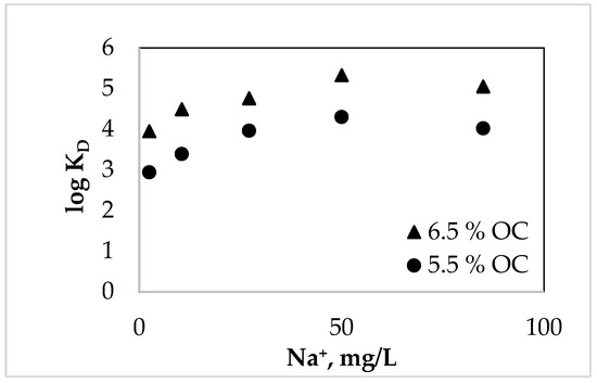 By increasing the concentration of Na+ in water, the increase in the sorption capacity of the sediment, for both OC% concentrations of weathered sediment, will be moderately influenced, until a 0.1 M aqueous concentration of Na+ is reached [29]. This was in accordance with previous results [30], where it was observed that natural organic matter, respectively OC%, increases the stability of sediment suspensions. Environmental concentrations are generally lower than 0.1 M; therefore, Na+ effect on the stability of sediment in aqueous systems is reduced [31]. In natural waters where Na+ concentration was higher than 180 mg/L, a stronger increase in TCC partition in the sediment was observed.