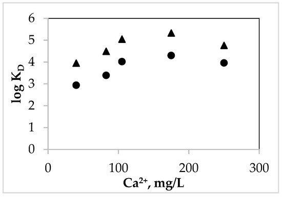 Figure 4 shows the variation in the distribution coefficients, log KD of TCC in the studied natural aqueous systems depending on the concentrations of Ca2+, in aqueous matrices at 5 and 25 °C.
