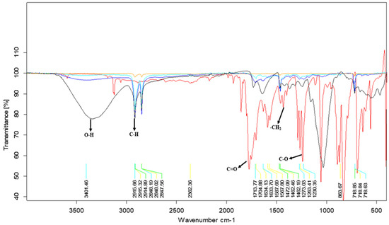 - Jayamani, E.; Loong, T.G.; Bakri, M.K. Comparative study of Fourier transform infrared spectroscopy (FTIR) analysis of natural fibres treated with chemical, physical and biological methods. Polym. Bull. 2020, 77, 1605–1629. [Google Scholar] [CrossRef]