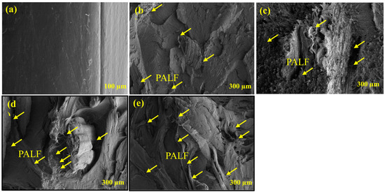 FTIR spectra are used to examine many functional groups found in natural fibers, including ketone groups, vinyl and carbonyl groups, hydroxyl groups, and more [34,35]. It is useful for determining how the chemical composition of natural fibers changes before and after the polymer composite. The characteristic hydroxyl group is common to all natural fibers, typically appearing with an intensity between 3336–3442 cm−1 [36]. The PALF filler FTIR spectra in Figure 1 depict the presence of the characteristic O–H group, which is apparent between the intensity range of 3323–3401 cm−1. The PALF exhibits common peaks owing to C=O and C–H stretching at 1713 and 2915 cm−1, respectively. The FTIR spectrum of the HDPE shows that the absorbance bands are located at 2914 cm−1, 2847 cm −1, 1472 cm−1, 1462 cm−1, and 718 cm−1 [37,38] shown in Figure 1. In the FTIR spectrum of maleic anhydride, the plot exhibited well-defined peaks at 1780 cm−1. Asymmetric and symmetric ring stretching of the (=C−O−C=) groups, unique to the cyclic ethers, were also clearly spotted at 1263 cm−1 and 1051 cm−1, respectively. From the opposite side of the monomeric structure, a relatively broad peak, noticed at around 718 cm−1, was identified as the stretching of the olefinic bond (C=C) [39]. The spectra of HDPE and PALF with MA samples, in contrast, clearly display different characteristic bands, indicating that the polymer structure was altered during reactive processing. The FTIR spectrum illustrates the direct relationship between MA on the HDPE backbone and the PALF filler content. Finally, the FTIR results of the HDPE/PALF/MA showed a broadened intensity of the hydroxyl group peak and a reduction in the carbonyl group peak at wave numbers of 3401 and 1713 cm−1, respectively. On the other hand, the composites showed a sharpened intensity of the alkane peak with an increase at a wave number of 2914–2847 cm-1. Figure 2 displays the cross-sectional SEM images of the neat HDPE and HDPE composites. In Figure 2a, the SEM images of the neat HDPE display a smooth and homogeneous structure. Moreover, the SEM images (Figure 2b,c) illustrate that the 5 and 10 wt.% added PALF was poorly dispersed within the HDPE composites, with noticeable interactions of PALF in the HDPE composites. The hydroxyl groups in the cellulose structure are responsible for this poor dispersion because they inhibit the interaction between the hydroxyl groups of cellulose and the HDPE composites by forming hydrogen bonds both within and between molecules [40]. Thereafter, Figure 2d,e illustrates that the MA modified the 5 and 10 wt.% PALF so that it was uniformly dispersed and well aligned in the HDPE composites. Covalent bonds developed between the cellulose hydroxy groups and maleic anhydride. As a result, the interface phases between the two matrices were improved by the presence of MA.