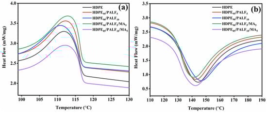 Differential Scanning Calorimeter (DSC) analyses were performed in a Perkin Elmer model 2500, with a continuous nitrogen flow rate of 30 mL/min. The temperature of the test samples (8 mg) was raised to 200 °C at a rate of 10 °C per minute. The melt–crystallization behavior of the HDPE/PALF composites was studied. The samples were then heated from 20 °C to 200 °C and held for 1 min and then cooled to 10 °C at the same rate.