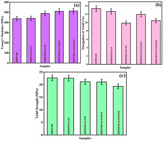 However, the yield strength and elongation at yield decreased when 5 and 10 wt.% PALF was added to the HDPE composites as shown in Figure 5a,b. Figure 5c shows that the tensile modulus of the HDPE composites was observed to increase with the increase in PALF content. This increase in modulus is to be expected when rigid fillers are incorporated into softer polymer matrices since at a high filler content, the composites will be able to withstand greater load. Furthermore, the addition of 5 wt.% MA in HDPE/PALF composites is displayed in Figure 5. The Young’s modulus increased, but the yield strength and elongation at yield decreased. The increased interfacial adhesion between HDPE and PALF with MA is the cause of this phenomenon. Similar behavior between the PP and the jute fiber has also been described by A.K. Rana to help understand the stiffness and strength of thermoplastics reinforced with fibers [52]. Several elements play a significant role in this. These include the microstructure, adhesion, fiber distribution, breakage and agglomeration, and weight fraction of the fibers. Maleic anhydride-grafted polyolefins are used to improve adhesion and dispersion [53]. This indicates that the interfacial adhesion was enhanced by the coupling agent MA added to the HDPE and PALF mixture. It suggests that when the maleic anhydride was added to the backbone of the hydrogen bond with the hydroxyl-terminated HDPE and PALF, the intermolecular force between the precursors increased [54,55]. Furthermore, using PALF as reinforcement worked well, as indicated by the composites’ increased moduli. Similar to reports from other researchers, compatibilizers, also known as MA coupling agents, are commonly used to reinforce composites that contain fillers [56]. The surface energy of cellulose fibers is raised to a level very near to the surface energy of the matrix following treatment with MA, according to observations by Mohanty et al., and better wettability and increased interfacial adhesion between the fiber and matrix are the outcomes, which raise the stiffness of the composites [57]. This research suggests that the yield strength and elongation at yield are reduced with increasing PALP/HDPE composite modulus. The weakening of the bond between the polymer and PALF filler as the filler concentration increases is the root cause of the composites’ decreased yield strength and elongation at yield (Figure 5c). The modulus increases as the concentration of PALF increases, indicating that sufficient stress transfer occurs across the polymer–filler interface. It is notable that at the highest filler content, the reinforcing impact of PALF in the HDPE and MA blend was predominant.