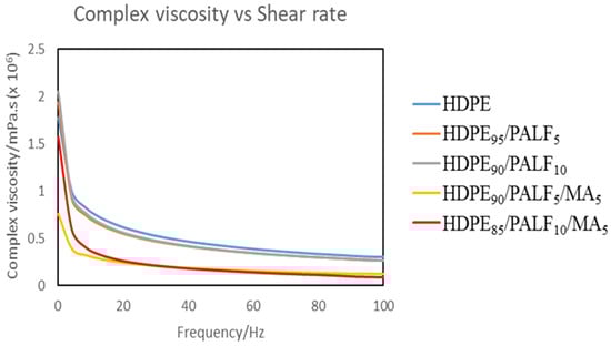 Changes in the complex viscosity of HDPE/PALF composites.