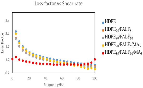 The loss factor shows the ratio of the viscous to storage modulus; thus, it is a good indicator of changes in the liquid sample behavior relative to solid behavior as the shear rate is increased (G″/G′). A loss factor greater than one indicates liquid behavior of the melt composite, and the higher the loss factor is, the more the liquid behavior of the composite, as shown in Figure 8. This was the case for all the samples, with HDPE showing the highest liquid behavior, while the rest of the samples followed the order: C5 > C3 = C2 > C4. One would expect the 10% PALF/MA to exhibit more viscous behavior than the 10% PALF due to the plasticizing effect of the MA; however, the opposite was observed. The low viscosity may enhance the good wettability and mixing of the fiber with the matrix or result in the separation of the relatively more mobile (liquid) matrix phase from the filler. If the latter happens, poor dispersion of the filler in the matrix results, leading to fiber agglomeration.