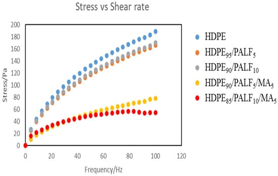 The amount of stress applied before composite flow clearly shows the degree of resistive forces present within the composite and HDPE structure. In contrast to most reports [62,63], the addition of 5 and 10% PALF lowered the stress resistance as shown in Figure 9. The neat HDPE samples showed greater resistance to flow than in the presence of PALF and MA. This suggests stronger polymer–polymer than polymer–filler forces. The low resistance to flow may be beneficial on the throughput rate and processing efficiency but has to be weighed against the desired mechanical properties of the resultant composites. The addition of MA drastically lowered the stress resistance. This indicates that the amount of MA used may have been a lot compared to fiber loading.