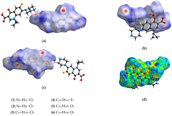 The HS showing (a) N3–H3A⋯Cl1, N3–H3B⋯Cl1, and C17–H17B⋯Cl1; (b) C14–H14A⋯F1 and C12–H12B⋯O1; (c) C15–H15B⋯O3 intermolecular interactions; and (d) ππ stacking found in the crystal packing for form I of the CIP.