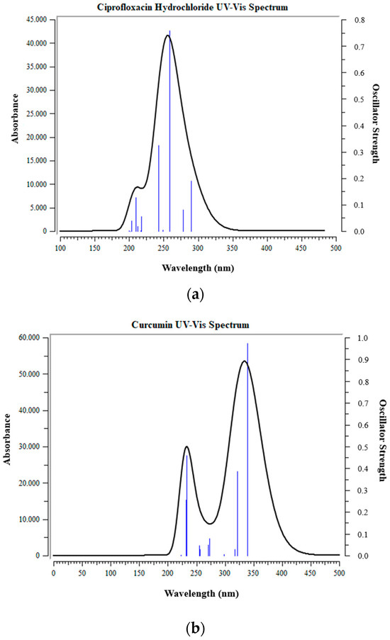 All these excitations are the result of the transition π → π*. During electronic excitation, the analysis of electron density differences between the ground and excited states [55] revealed that electrons tend to migrate toward the regions of the carbonyl and carboxylic groups, as well as the amine group, extending to the cyclopropyl moiety. For CUR, the UV-vis absorption spectrum showed an absorption peak in the range 275–450 nm of the UV-Vis spectrum (Figure 5b), consistent with the observed experimental results. The π → π* transition observed in the first excited state (S1) at 339.60 nm and attributed to the H → L excitation is a result of the electronic movement of the aromatic portion towards the central region of the molecule, where the carbonyl chromophore group responsible for the photoreactive effects of CUR is present [56]. Finally, in the CIP+CUR structures, two peaks were observed: one in the range 280–475 nm and another in the range 225–280 nm (Figure 5c). The results of the calculations showed that the first peak is due to electronic excitations due to the presence of CUR, whose value is located around 340 nm. In this state, it was observed H → L excitation occurred at 83.107 kcal/mol with a value of 1.0392 (like that observed for isolated CUR). The second peak has a λmax value located at 259 nm which occurs from the H−3 → L+3 excitation present in the CIP molecule, at an value roughly of 110 kcal/mol. These data indicated that CUR does not act as a protective agent for CIP in CIP+CUR complex structures.