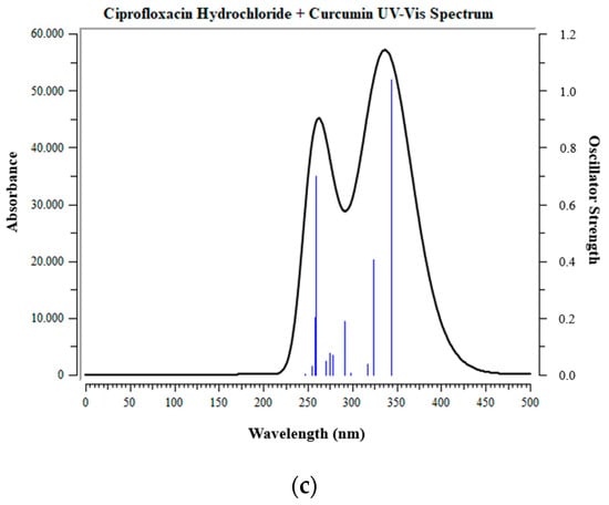 UV-Vis absorption spectra of (a) ciprofloxacin hydrochloride, (b) curcumin, and (c) CIP + CUR, obtained at TD-DFT/CAM-B3LYP/6-311++G(d,p) level of theory.