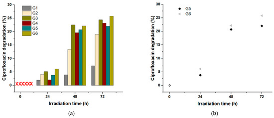 From the analysis of the data obtained and presented in Figure 6a, it was observed that CIP (G1) undergoes slight degradation (up to 7.3%) at the irradiation time of 72 h. When H2O2 was added, an increase in CIP degradation was observed (up to 19% in 72 h), which can be attributed to the direct dissociation of H2O2 into ∙OH through absorbing ultraviolet light (<320 nm) [57]. For group G3 (CIP + CUR (1:0.5)), a photooxidative effect was observed due to the presence of the CUR photocatalyst, resulting in a degradation of CIP of up to 24.4%. The photooxidative effect likely results from the action of photoactive CUR in the presence of O2, generating ROS in the reaction medium [58] (Equation (1)). Furthermore, it was evaluated whether the increase in CUR concentration could result in increased degradation of CIP via photooxidative action; however, this increase in concentration (CIP + CUR (1:1)) supposedly caused competition between the CIP molecule and CUR by ROS generated in situ [59] (Equations (2)–(4)).