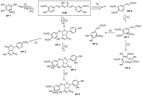 CUR acts as a photocatalyst by absorbing light and transferring electrons or energy to O2, generating ROS. Additionally, CUR undergoes photodegradation via a photooxidative process, leading to the formation of several photodegradation products (DP 1-9) in the presence of light and O2 (Figure 7) [57,60]. The competition among these processes increases the rate of CUR degradation due to the oxidative action of ROS. However, this competition does not enhance the degradation of CIP, even with an increased amount of photocatalysts. Finally, the existence of a synergistic effect between the CUR photocatalyst and H2O2 as an oxidant in the degradation of CIP (G5–G6) was observed. However, the presence of H2O2 potentiated the degradation of the pharmaceutical CIP.