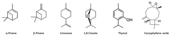 Chemical structures of the target BVOCs studied in the present work, including five monoterpenoids (α-pinene, β-pinene, limonene, 1,8-cineole, and thymol) and one sesquiterpenoid (caryophyllene oxide).