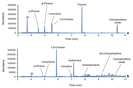 Example of total ion chromatograms obtained from a standard mix (a) using GC-MS and the leaves of Thymus camphoratus (b) using HS-BAμE(CN1)/GC-MS under optimized conditions.