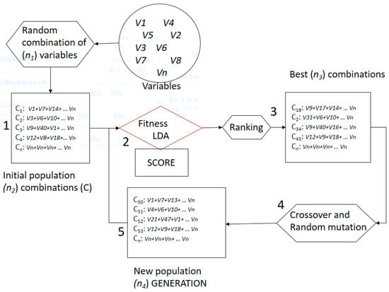 Then, a chemometric approach for the botanic and geographic authentication of the honey samples was developed based on a genetic algorithm (GA) to find the best combination of VOCs that, when used to run a linear discriminant analysis as the fitness function, allowed us to achieve such an aim. The adopted GA (that was run independently for botanical and geographic authentication) is represented by the flowchart in the scheme in Figure 1.